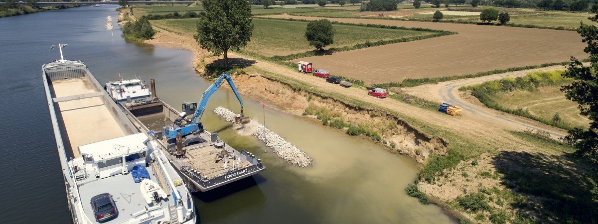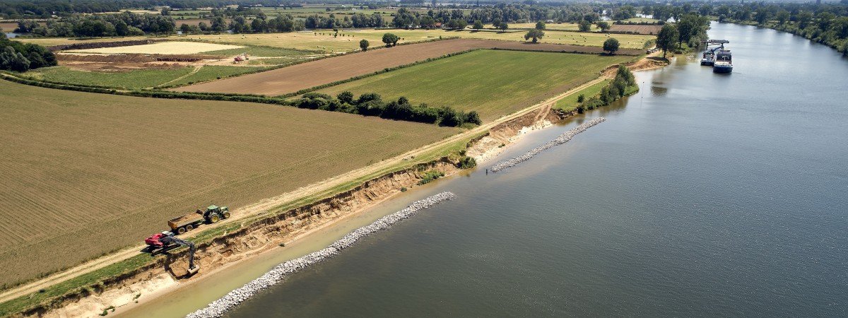 Logisch gevolg van de tijd, stroming en scheepvaart is dat er op sommige plekken erosie of afkalving van de oever ontstaat. Op de plekken waar de oever te ver afkalft of waar dit dreigt, gaan we aan het werk. Afhankelijk van hoe de oever eruitziet, nemen we maatregelen om deze te herstellen of te beschermen. Denk hierbij aan het toevoegen van extra grond aan de oever of het aanleggen van een klein dammetje om te voorkomen dat golven schade veroorzaken.